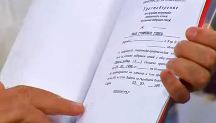 Това е „Удостоверение за издържан теоретико практически изпит за успешно завършен стаж”. То също няма номер, в полетата на бланката липсва и номера на дипломата, и факултетен номер, липсва и подписът на министъра на правосъдието. Тези места, както в дипломата, са оставени празни. Те също не са лични данни. Само в долния край на листа има надпис „Вярно!”, като заверка на копието.