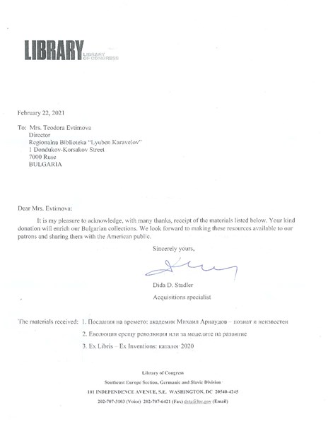 Директорът на Регионална библиотека „Любен Каравелов“ – Русе получи благодарствено писмо от Конгресна библиотека – Вашингтон, подписано от Дида Стадлер – отдел „Югоизточна Европа, германистика и славистика“.