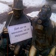 Над 10 емблематични за София паметници осъмнаха с противогази и табели с иронични надписи.