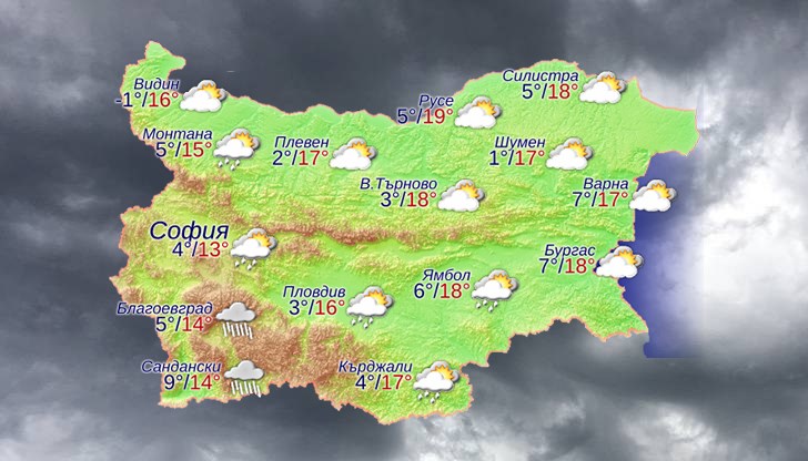 Максималните температури ще бъдат между 14° и 19°, в София: 13°-14°, а в Русе - 19°.