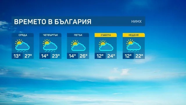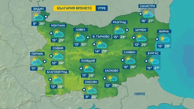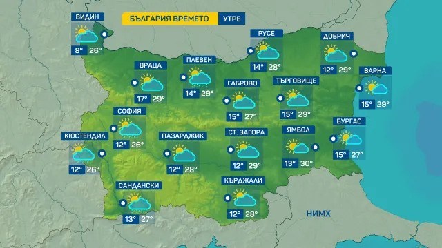 В районите на север от планини се очаква силен и дори бурен поривист вятър от юг. Минималните температури утре ще бъдат между 10 и 15 градуса, а максималните - между 25 и 30 градуса, информира bTV.