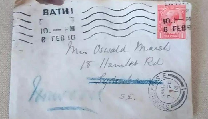 Писмо, изпратено през февруари 1916 г., пристига на адрес в южен Лондон повече от 100 години по-късно. Пликът с пощенско клеймо от Бат и с марка от 1 пенс на крал Джордж V пристига в апартамента на 27-годишния Финлай Глен в лондонския квартал Кристъл Палас през 2021 г., но това става ясно едва сега, съобщава Би Би Си, предаде OFF News.