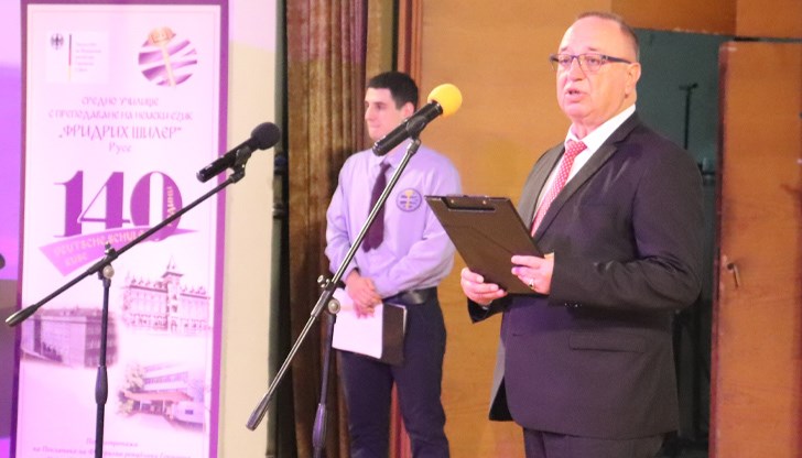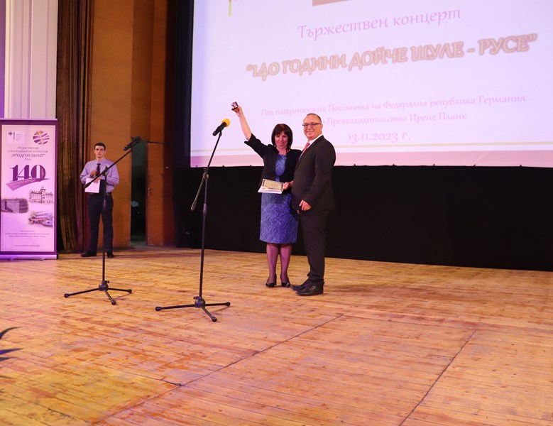 Педагогическият екип на Средното училище с преподаване на немски език /СУПНЕ/ „Фридрих Шилер“ в Русе бе удостоен със знака на областния управител Данаил Ковачев. Отличието бе връчено от заместник областния управител Георги Георгиев, като то се присъжда за цялостен принос към развитието на средното образование в региона и по случай 140-ата годишнина от създаването на първото немско училище в България. Почетният знак бе получен от директора на гимназията Искра Иванова късно снощи по време на празничния концерт, посветен на юбилея на училището, който се проведе в зала „Филхармония“ и бе под патронажа на посланика на Федерална Република Германия в София Н. Пр. Ирене Планк. „За дългия път, който сте изминали, Вие успяхте да се утвърдите като бързоразвиваща се и адекватна на съвременните изисквания образователна институция. Пожалвам Ви да продължите да надграждате основите, които сте положили, защото това е гаранция и за бъдещия Ви успех. Благодарение на Вас – ръководството и учителите, училището има съвременна европейска визия, а неговите възпитаници са придобили необходимите умения за справяне с предизвикателствата на утрешния ден“, каза Георгиев в обръщението си към директора и педагогическия екип. Също така той благодари на учителите, че са превърнали училището в мерило за грамотност и ги поздрави за стремежа да обучават иноватори и хора с активна гражданска позиция. Заместник областният управител призова учениците да бъдат свободомислещи и готови да поемат по своя житейски път, уверени в знанията, които се придобили в училището. „Вярвам във вашата силна мотивация всеки ден да научавате по нещо ново и различно и да разширявате хоризонта на очакванията си. Бъдете лидери, бъдете смели в мечтите си“, допълни Георгиев. Той посочи още, че и занапред училището ще получава подкрепа от държавата.