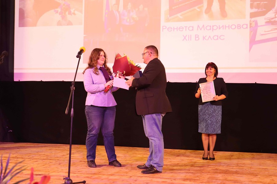 Таня Тодорова връчи на директора Искра Иванова поздравителен адрес от кмета Пенчо Милков. В написаното от кмета бе посочено, че училището успешно съчетава духа на традициите с ясното намерение за развитие на образованието. „Благодарение на усилията за бивши и настоящи учители тук се развива качествено образование, възпитаващо достойни хора. Силно вярвам, че целият екип ще продължите с неугасващ ентусиазъм да давате най-доброто от себе си. Нека вдъхновението и жаждата за знание да Ви водят напред по пътя на просвещение на следващи поколения русенци“, се казва в написаното от Милков.