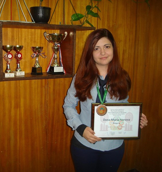 Бронзов медал от Международната олимпиада по математика за момичета спечели десетокласничката от МГ „Баба Тонка” – Русе Дона-Мария Радославова Иванова. Тя беше единственият представител на града ни на престижната надпревара, която се състоя в Минск, Беларус от 14 до 20 април.