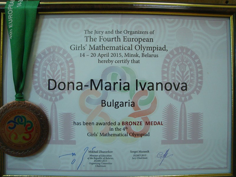 - Бронзов медал от Европейска олимпиада по математика за момичета – EGMO 2015;