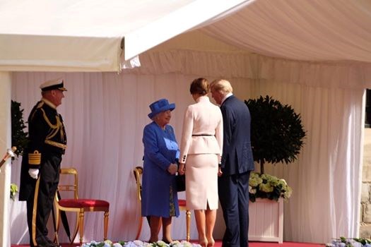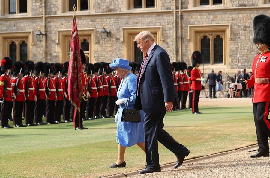 Президентът на САЩ обаче беше приветстван от военен оркестър в Уиндзорския замък, след което той и съпругата му Мелания влязоха да пият чай с кралицата.