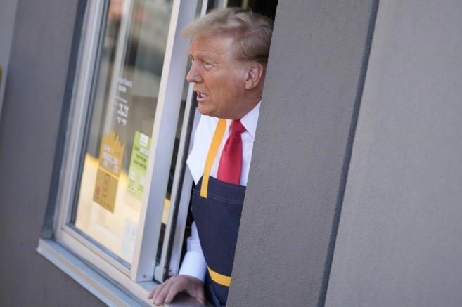 В необичайна предизборна проява бившият президент на Съединените американски щати Доналд Тръмп застана зад щанда на ресторант McDonald's в Пенсилвания, за да сервира пържени картофи. Облечен в характерната черно-жълта униформа на веригата, поставена върху бяла риза и червена вратовръзка, 78-годишният републикански кандидат за президент се включи в работния процес в неделя.