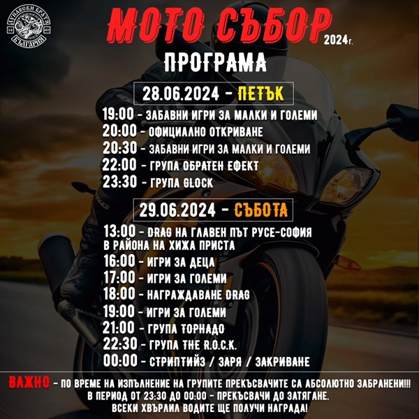 Днес, на изхода на Русе след „Метро“ в посока София, ще се проведе дългоочакваното драг състезание, част от годишния мото събор на Мото клуб „Дунавски братя“ за 2024 година. Събитието е планирано да започне от 13:00 часа и обещава да бъде истинско шоу за любителите на моторите и скоростта.