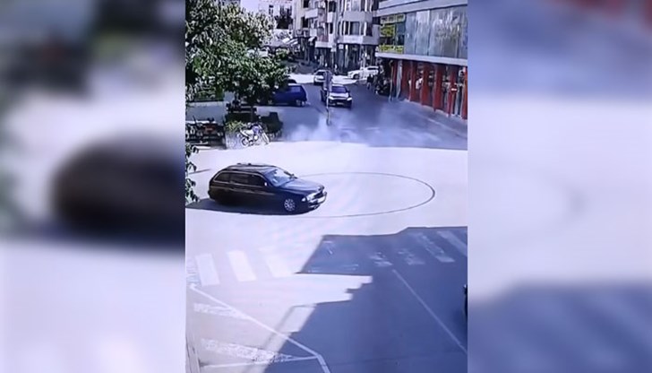 Дрифт посред бял ден на оживено кръстовище в центъра на Петрич. Видеото е запечатано от камера на Община Петрич и е публикувано на страницата ѝ във Фейсбук.
