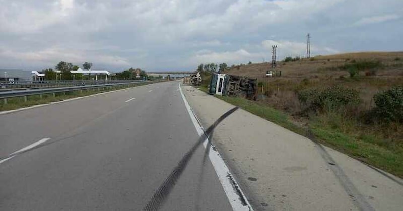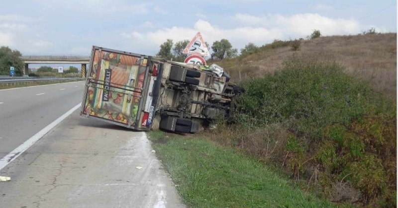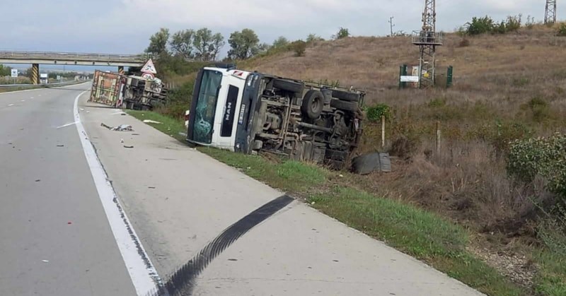 Според първоначалната информация, автомобил с марка "Фолксваген Крафтер" със софийска регистрация е ударил отзад движещ се пред него товарен автомобил МАН. От удара в крайпътната канавка са се преобърнали и двата камиона, съобщиха от полицията.
