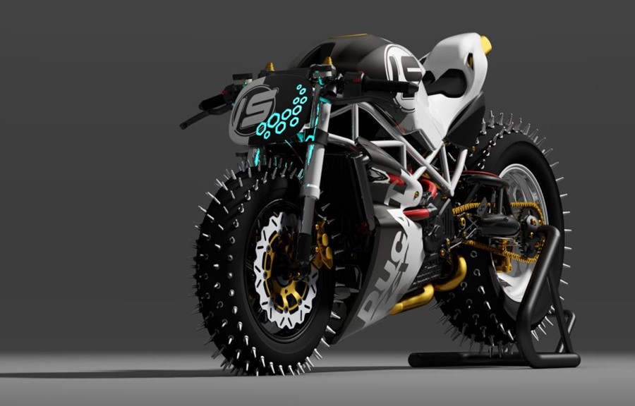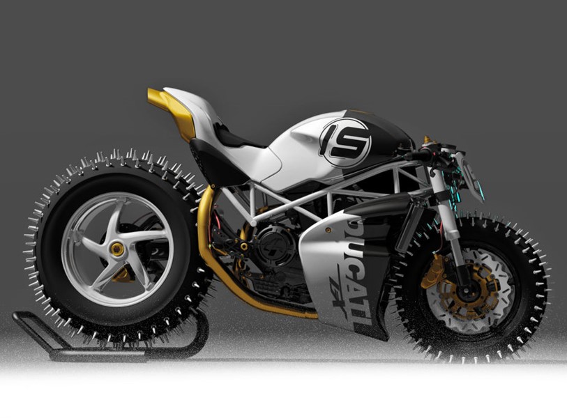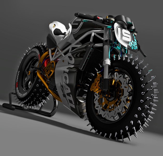 “Кръстих го “The Monster of Ice”. Мисля, че от “Ducati” трябва сериозно да се замислят за вкарването му в произвоство, защото моделът наистина ще се продава. Освен шиповете, гумите са по-офроуд, а и задното колело е по-масивно. Трудно е мотористът да го балансира, но това важи само при спряло положение. При движение обаче сцеплението е много по-добро”, разкрива Тесио.