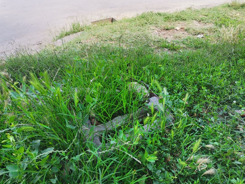 Забележете колко дни водата не се оттича изобщо! Счупената шахта си лежи "невинно" в тревата. Ако някоя кола уцели отворената шахта... не ми се мисли.