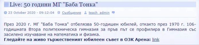 По случая с честването на патронния празник в ОЗК Арена на МГ "Баба Тонка" искам да допълня госпожата от издадената статия, че в края на концерта по микрофона бяха поканени всички ученици и учители на сцената, за да изиграят едно ОБЩО Дунавско хоро.