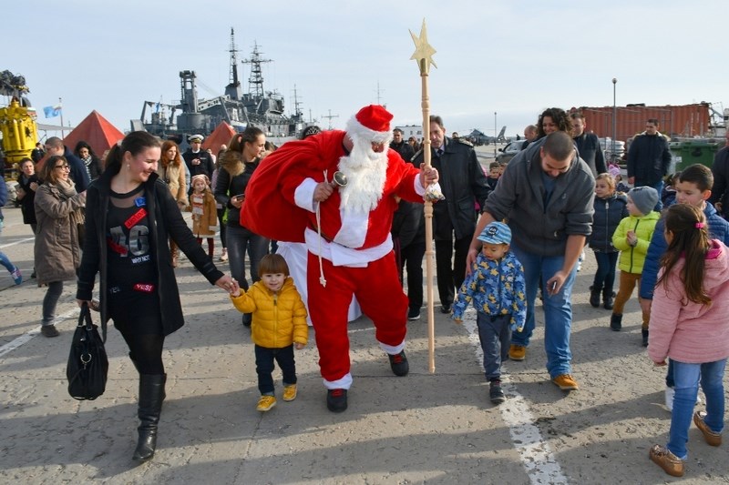 След безаварийното кацане повече от 100 малчугани и техните родители, военнослужещи и цивилни служители от Варненския гарнизон съпроводиха Дядо Коледа и Снежанка до празнично украсената спортна зала на Пункт за базиране Варна.