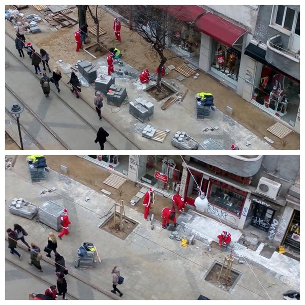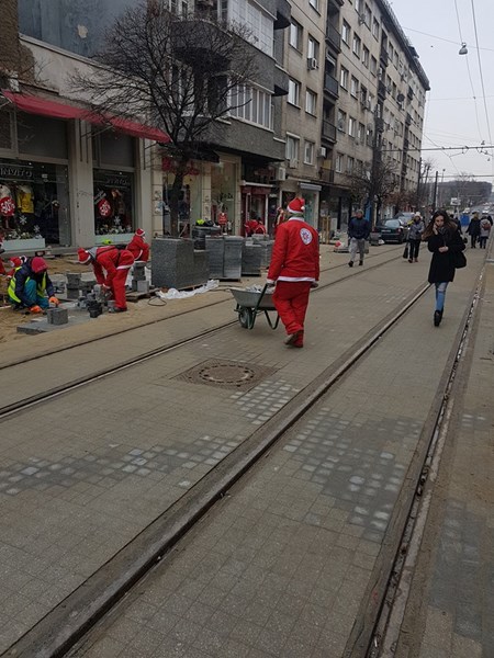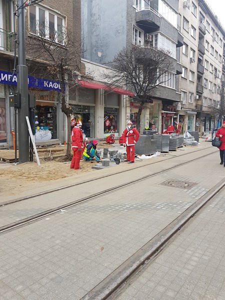 Днес обаче ремонта на софийската улица върви с пълни обороти и то не с кого да е - десетина Дядо Коледовци работят неуморно на мястото, сподели Economic.