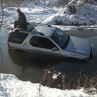 Двама от мъжете скочили в ледените води и излезли на брега, но третият не искал да се мокри и се качил на покрива на колата.