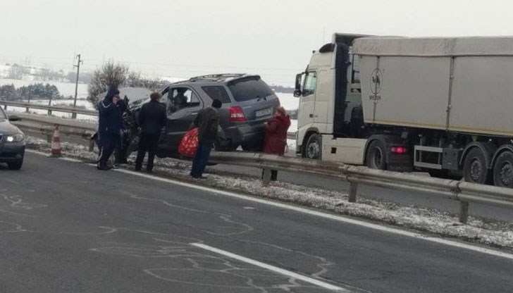 Пострадали няма. Една жена е откарана в болница с леки наранявания. Инцидентът е станал малко след 13 ч. Лек автомобил е загубил контрол и се е завъртял на пътното платно, вследствие на което се удря в мантинелата, съобщава БТВ.