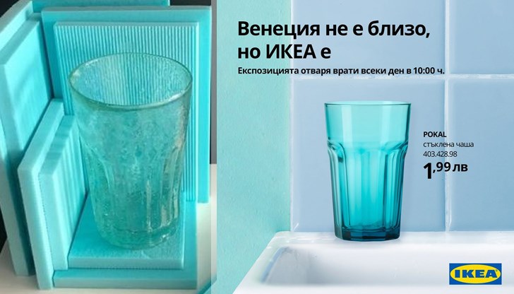 Мебелната компания ИКЕА пусна реклама с водни чаши, които твърде много приличат на онези, с които България се представи на 58-ото биенале по съвременно изкуство във Венеция, като ги обяви за „арт инсталация“, пише Клуб Z.