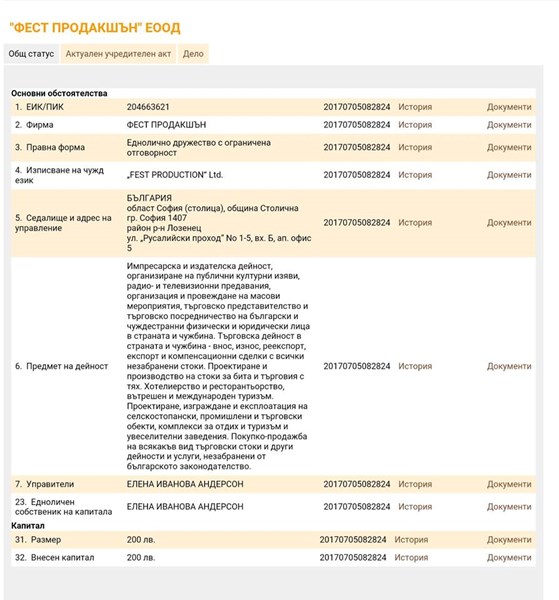 Това беше достатъчно да ме мотивира да започна да ровя и фирмата организатор се оказа " Фест Продакшън" ЕООД създадена специално за случая на 05.07.2017 г. със собственик лицето Елена Иванова Андерсон свързана с безброй фирми прилагам линк за по любопитните: