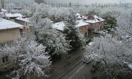 Снегът заваля още вчера след обяд и не е спирал. Едрите парцали затрупаха цъфналите дръвчета, а стопани се притесняват, че и тази година няма да има плодове от овошките, пише Struma.bg.