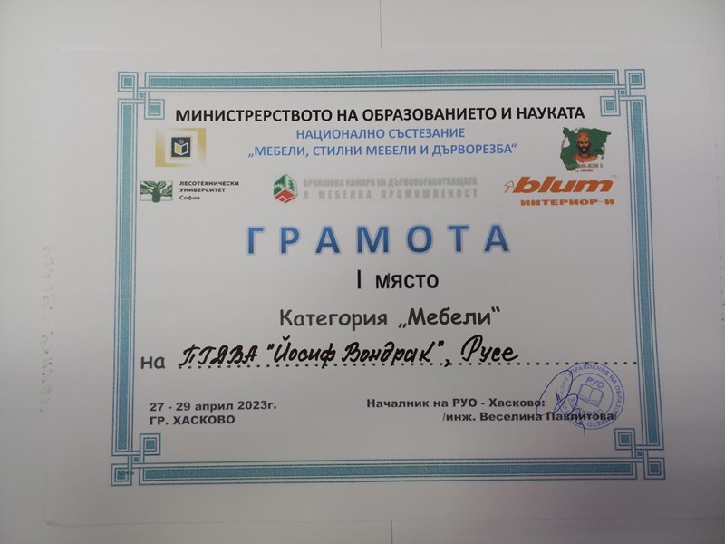 С първа награда от Националното състезание „Мебели, стилни мебели и дърворезба“ на Министерство на образованието и науката в категория „Мебели“ беше отличен екипът на ПГДВА „Йосиф Вондрак“ - Русе. В състезание с десет професионални гимназии от цялата страна. Третата комплексна награда получи русенското училище за проекта, представянето и изработването на Детска люлка за градина и комплект масичка с 4 табуретки за деца под формата на стилизирани животински глави за градина или в домашни условия.