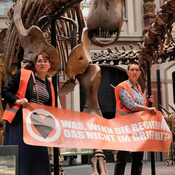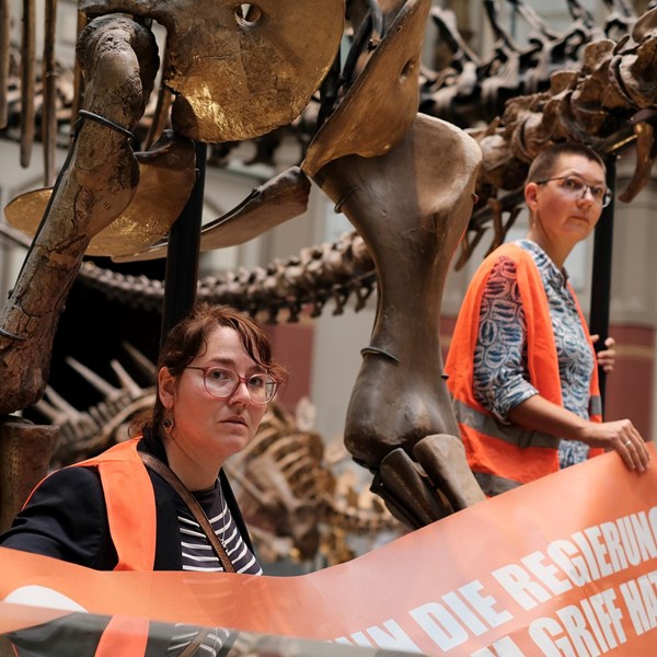 Екоактивисти се залепиха за скелет на динозавър в Берлин