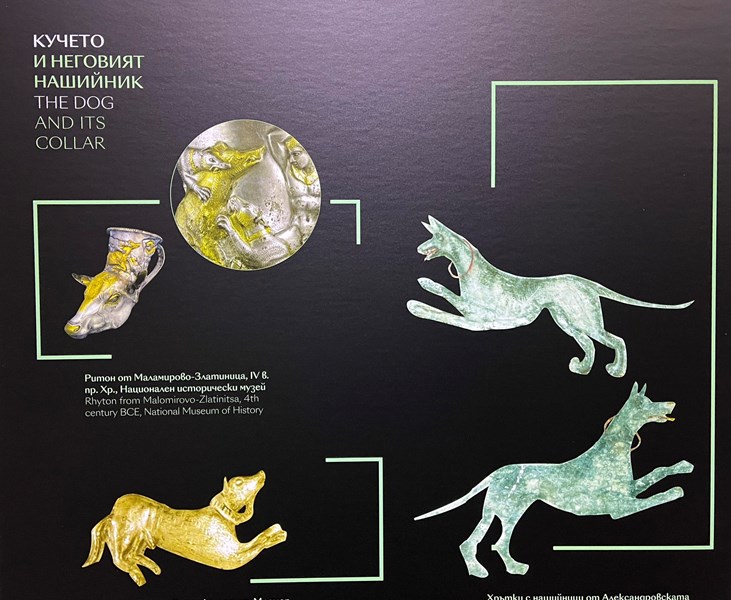 Експозицията включва сцени от ритуален лов на елен и глиган, познати от гробницата в Александрово, които илюстрират важното място на четириногите в бита и ритуалите на траките. Учените предполагат, че някои специфични породи, като гончетата, са били внасяни от чужбина или са служили като ценни дипломатически подаръци между владетелите.