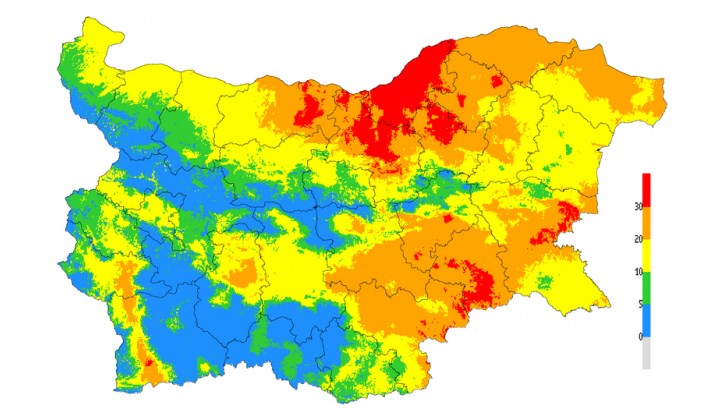Това сочи справка на сайта на Националния институт по метеорология и хидрология (НИМХ). Индексът важи за областите Благоевград, Хасково, Ямбол, Сливен, Бургас, Плевен, Велико Търново, Русе, Търговище и Разград.