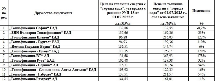Столичното топлофикационно дружество е единственото, което иска намаляване на цената на топлинната си енергия, макар и с едва 0.2 процента, което потребителите реално няма да усетят в сметките си. Всички останали искат повишение между 6 и 178 на сто.