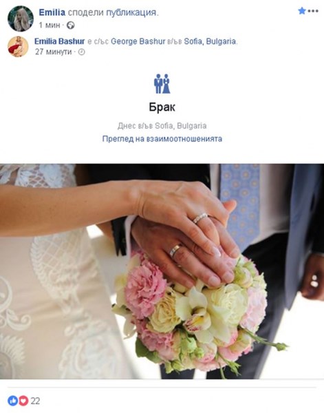 Певицата веднага си смени статуса в социалната мрежа, както и фамилията. Тя публикува и снимка, на която се виждат нейните ръце и тези на възлюбения й, украсени с венчалните халки.