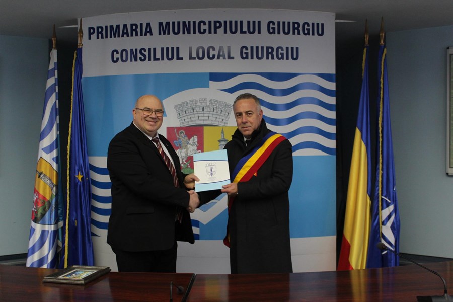 Кметът Адриан Ангелеску получи като подарък от Община Русе картина на Дунав мост. Тя символизира сътрудничеството на двете общини за реализирането на проекта Дунав мост 3 между Русе и Гюргево.