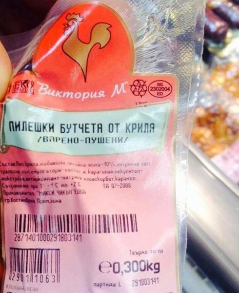 На фотото се вижда опаковката на "нещо", което е наименувано "Пилешки бутчета от крила", произведени в гр. Костинброд.