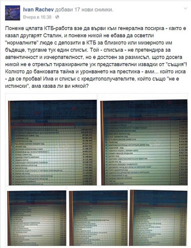 Във Фейсбук се разпространява списък на 510 „топ” вложители на КТБ.