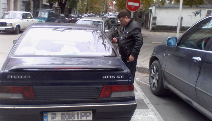Това е г-н Иван Ангелов, служител на общински паркинги град Русе, който поставя скоби за неправилно паркиране, а същият е спрял неправилно на маркировка и кръстовище образувано от улица "П. Д Петков" и ул."пр. Асен Златаров".