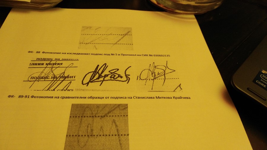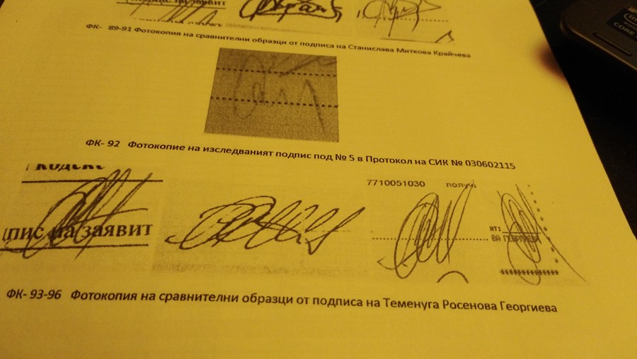 35 странична съдебно – почеркова експертиза е изготвена от вещото лице Емил Атанасов – експерт – криминалист, по административно дело №3233/2015 година, възложена от 34 състав на Административен съд – Варна, за това алармира Афера.