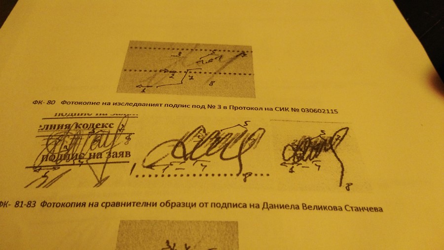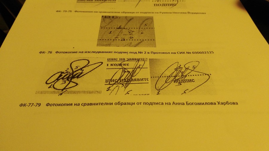 Съдебната почеркова експертиза подлага на подробен анализ протокол на СИК № 030602115 във Варна, притежаван и предоставен от „Движение 21“ на съда. В този протокол членовете на Секционната избирателна комисия са шестима, както следва: Румяна Ненчева Иванова, Анна Богомилова Харбова, Даниела Великова Станчева, Димка Димова Генова, Станислава Миткова Крайчева и Теменуга
