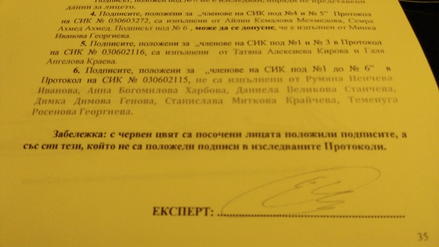 СЪДЕБНАТА ЕКСПЕРТИЗА УСТАНОВЯВА, ЧЕ „ПОДПИСИТЕ ПОЛОЖЕНИ ЗА „ЧЛЕНОВЕ НА СИК ПОД №1 ДО №6 В ПРОТОКОЛ НА СИК № -030602115 НЕ СА ИЗПЪЛНЕНИ ОТ ТЯХ! Т.Е. И ШЕСТТЕ ПОДПИСА ПОД ПРОТОКОЛА СА НАПЪЛНО ФАЛШИФИЦИРАНИ!!!