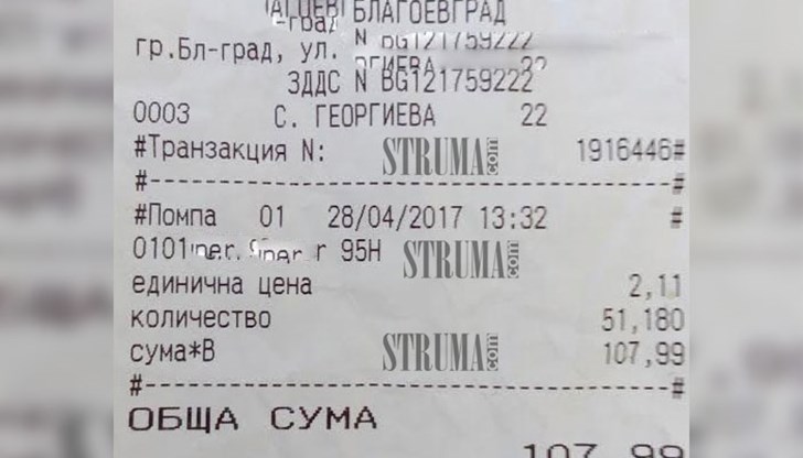 Сумата, която заплатих беше 107,99лв. Цената за литър бензин в този ден беше 2,11лв. По принцип, когато зареждам на други бензиностанции, плащам не повече от 90лв. Именно това ми направи впечатление и реших да проверя касовата бележка (която пазя и при необходимост мога да предоставя). Оказа се, че служителите на бензиностанцията са напълнили в моя резервоар 51,180 л.