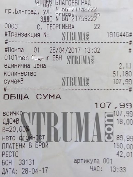 "Управлявам лек автомобил Шкода Фабия. Вчера (28.04.2017г.) петък, отидох да заредя бензин (95H) на бензиностанция, която се намира на един от булевардите в Благоевград.