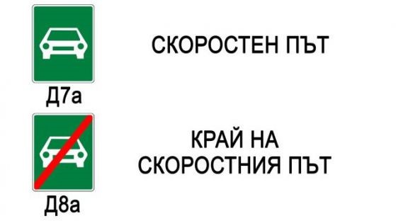 Ето как ще изглеждат новите знаци Д7а, Д8а - начало и карай на скоростни пътища, и знак Е24 - пътен участък, който е под видеонаблюдение. Ще има промени във вида и на знаци Е22, където ще бъде добавено поле за скоростен път с ограничение на скороста до 120 км/ч.