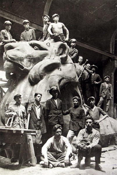 Лъвът е излят във Военния арсенал от група майстори начело със Стефан Вежански. Той разказва: “Скулпторът Кирил Шиваров, Баче Киро, под чиито ръце е създаден лъвът, много държеше да се снимаме, той ни намери и апарата. Направихме си няколко пъти “кадро” с фигурата на лъва, за да проличи големината ѝ. Тая грамада бронз, плътна отливка с необходимите кухини, е минала през ръцете ни.”