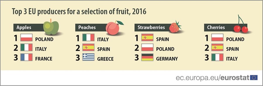 Най-произвежданият плод в Европа са ябълките с 12,5 милиона тона за година (или 25 кг на всеки европеец), а там Полша е номер едно – над една от всеки 4 ябълки на пазара идват от централноевропейската държава. Полша също така е основен производител на череши (29,3%).