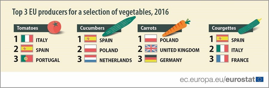 Най-разпространеният зеленчук в ЕС са доматите. През 2016 г. добивът на тази култура възлиза на 18,5 млн. тона, което прави по 36 кг на всеки европеец. Италия (35,5%) и Испания (28,2%) осигуряват почти две трети от него.