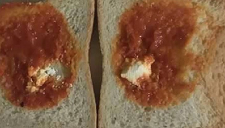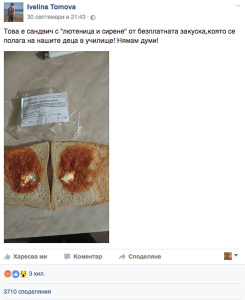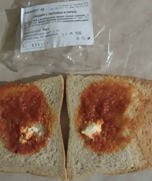 „Това е сандвич с "лютеница и сирене" от безплатната закуска, която се полага на нашите деца в училище! Нямам думи!“, е написала майката под снимката.