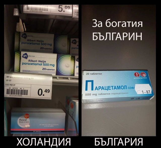 Ситуацията и във фармацевтичната индустрия е не по-различна. Така например българин, живеещ в Англия, информира, че цената на най-евтиния парацетамол там възлиза на 19 пенса. У нас парацетамола струва средно 1.87 лв. „Умишлено ли се подиграват с нас, не мога да разбера?!”, гласи поредният коментар в мрежата, придружен от две снимки – едната, направена в дрогерия в Айндховен, Холандия, и втората – в София, България. Разликата в цената е точно два пъти!/
