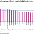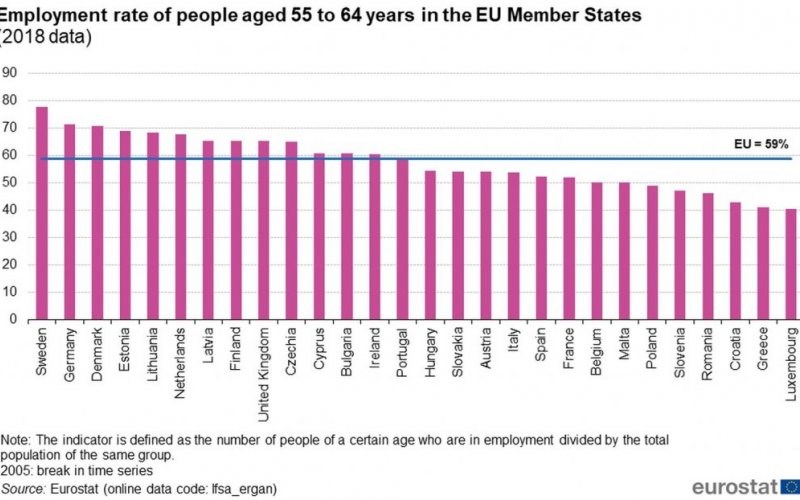 През 2018 г. равнището на заетост сред хората на възраст от 55 до 64 години е било над 70% в Швеция (там е 78%), Германия и Дания. В Малта, Полша, Словения, Румъния, Хърватия, Гърция и Люксембург пък процентите за тази възрастова група са под 50%.