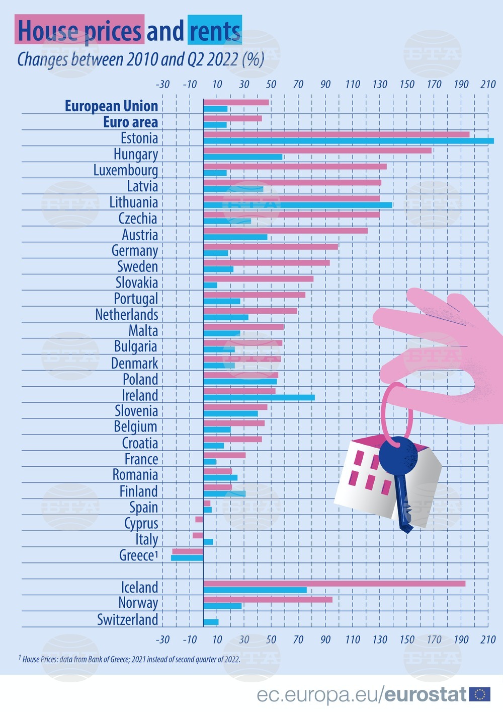 Цените на жилищата се повишават с по-бързи темпове в сравнение с наемите в 19 страни от ЕС, сред които и в България, между 2010 г. и второто тримесечие на 2022 г., по данни на Евростат.