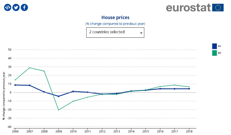 Цените на жилищата, включително покупките на нови и съществуващи къщи и апартаменти, варират значително от 2010 г. насам, като годишните темпове на растеж у нас /и в европейски мащаб/ са били най-значими през последните 5 години, показват данни на Евростат за пазара на жилища в ЕС в периода 2010-2018 г.