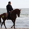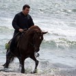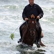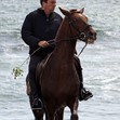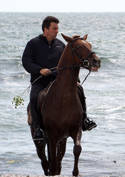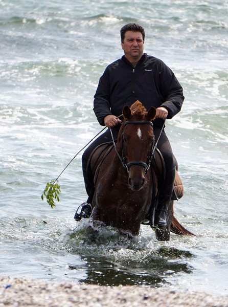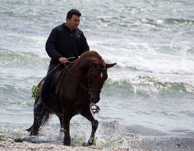 Ездач влезе за малко в морето на плажа на квартал Аспарухово, за да разхлади краката на коня след усилна тренировка в базата на Аспаруховото селище "Фанагория".